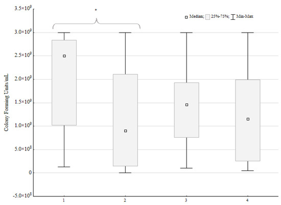 The Wilcoxon ranked test was used to ensure that the P. aeruginosa CFU/mL loss under the influence of P. mirabilis was statistically significant (Figure 3). Both tests proved the significant impact of the P. mirabilis strains on P. aeruginosa CFU/mL (p < 0.05, α = 0.05). However, for the P. mirabilis species, there was no significant difference in the CFU/mL under the influence of P. aeruginosa.