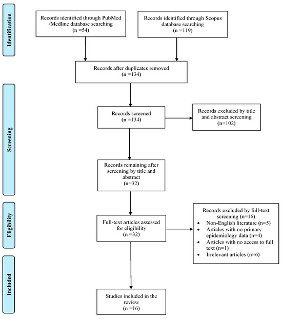 A total of 173 articles were identified through searches in the PubMed and Scopus databases. After removing duplicates, screening records, and applying the snowballing method, only 16 articles met the inclusion criteria and were included in the final analysis [7,10,11,12,13,14,15,16,17,18,19,20,21,22,23,24]. These studies collectively reported on 16 patients. A flow diagram outlining the selection process is shown in Figure 1.