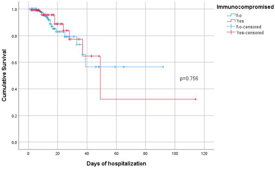 In total, 393 of 400 collected patients (immunocompromised with HM or AC: n = 131, 33.3%; non-immunocompromised: n = 262, 66.7%) were analyzed. Their characteristics are depicted in Table 1. The majority of the patients were males n = 199 (50.6%), and the mean age was 64.7 years (SD = 16.1). According to the World Health Organization (WHO) criteria [20], most of the patients (n = 211, 54%) had severe COVID-19 and were vaccinated against COVID-19 (n = 209, 53.9%). The percentage of any vaccination against COVID-19, or fully (3 doses), or boosted (>3 doses) was significantly greater in the immunocompromised patients, while the group of non-immunocompromised patients were more likely to be partially vaccinated (≤2 doses). All patients received remdesivir for COVID-19, with significant greater duration of treatment in the immunocompromised group according to physician choice, due to the underlying disease and the longer duration on steroids therapy. On the other hand, tocilizumab was an add-on therapy against COVID-19, mostly for non-immunocompromised patients. Concomitant diseases were more significantly encountered in immunocompromised patients, which also experienced longer duration of hospitalization and had greater probability of a secondary bacterial infection. Overall, 44 (11.5%) patients were intubated and 30 patients (7.6%) died, without significant difference between the two groups (p = 0.972 and 0.999 respectively). Also, mean hospitalization time till death for non-immunocompromised patients was 63.6 days (SE = 7.1), and for immunoconficompromised patients it was 61.9 (SE = 16.4), without being significantly different from each other (p = 0.756) (Figure 1).