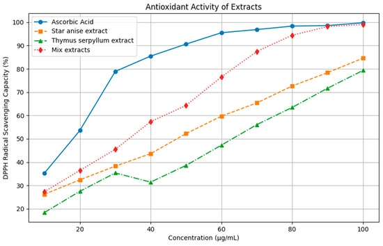 3.2.1. Phytochemical Composition of Star Anise and Thymus Extracts and Their Mixture