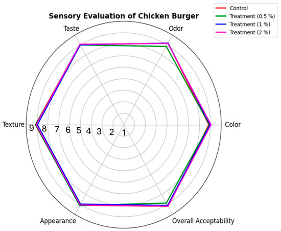 3.3.2. Sensory Evaluation of Chicken Burger Fortified with Mix Extract