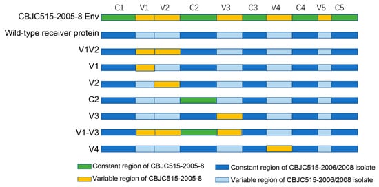 Schematic representation of chimeric HIV-1 Env constructs. Donor (CBJC515-2005-8) Gp120: C1–C5 (green), V1–V5 (yellow). Recipient (wild-type receiver protein, CBJC515-2006/2008) backbone: C1–C5 (dark blue), V1–V5 (light blue). All domains follow HXB2 numbering.