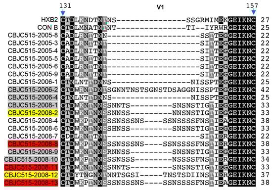 - Yu, Y.; Feng, Y.; Zhou, Z.; Li, K.; Hu, X.; Liao, L.; Xing, H.; Shao, Y. Substitution of gp120 C4 region compensates for V3 loss-of-fitness mutations in HIV-1 CRF01_AE co-receptor switching. Emerg. Microbes Infect. 2023, 12, e2169196. [Google Scholar] [CrossRef]