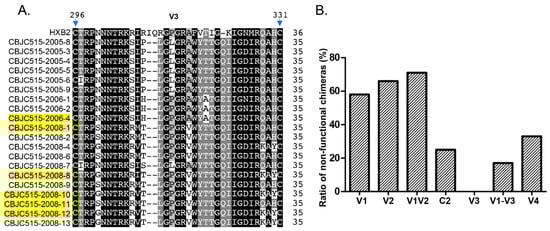 Sequence alignment of the V3 region (A) and frequency of nonfunctional chimeras with different envelope regions (B). (A) The V3 region alignment shows conserved amino acid sequences represented by grayscale shading (gray, dark gray, and black for increasing conservation). Resistant chimeras are highlighted in yellow. (B) The bar graph illustrates the proportion of nonfunctional chimeras generated for each chimeric region (V1, V2, V1V2, C2, V3, V1-V3, and V4).