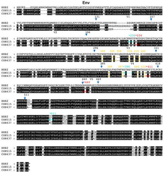 The SGA products were sequenced using an ABI 3700 Sequencer (Applied Biosciences, Foster City, CA, USA). Full-length gp160 gene fragments were assembled and edited using Sequencher 4.1 (Gene Codes, Ann Arbor, MI, USA). All chromatograms were manually inspected for mixed bases (double peaks), and sequences exhibiting ambiguities were excluded from subsequent analyses. Env nucleotide sequences were aligned against the HIV-1 HXB2 reference strain using Gene Cutter (https://www.hiv.lanl.gov/content/sequence/GENE_CUTTER/cutter.html, last accessed 16 February 2025), and corresponding amino acid (aa) sequences were derived from the nucleotide alignments. Potential N-linked glycosylation sites (PNGS) were predicted using N-Glycosite (http://www.hiv.lanl.gov/content/sequence/GLYCOSITE/glycosite.html, last accessed 20 February 2025) from the Los Alamos HIV Database. Consensus sequences were generated using the online tool Consensus Maker (https://www.hiv.lanl.gov/content/sequence/CONSENSUS/consensus.html, last accessed 21 October 2020). Sequence identity and similarity between the 2005 Env consensus and individual functional clones were computed using the LALIGN tool (http://www.ch.embnet.org/software/LALIGN_form.html, last accessed 22 February 2025).