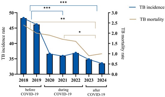 8]. In 2024, tuberculosis incidence (per 100,000 people) and mortality were significantly reduced by 30.5% (to 33.5) and 58.3% (1.0), respectively, reflecting improved health outcomes in the post-pandemic period.