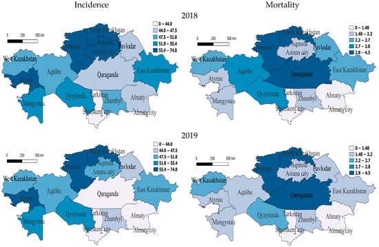 Figure 2). In 2019, there was high mortality in two northern regions—North Kazakhstan and Qostanai—and one central region—Qaraganda. At the same time, mortality in one western region—Aqtobe—and in East Kazakhstan decreased by 25% and 25.9% to below average, and the rest had low mortality (