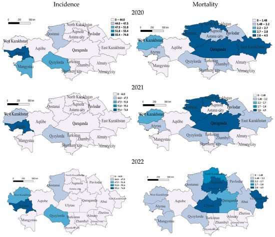 29]. Generally, the northern, central, southeastern and eastern regions had low incidence during the COVID-19 period, especially in 2021. In these regions, the incidence was consistently low, especially in Almaty, Turkestan, Zhambyl and Shymkent, possibly due to the milder climate preventing a decrease in the overall health of the country (