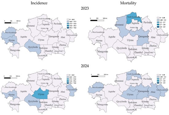 In the COVID-19 period, in 2023, only three regions belonged to the group with incidence rates slightly below average—the southern region of Qyzylorda and Western Kazakhstan and Atyrau, already included in this group, in the west, with the rest of the regions having relatively low incidence rates. With an average mortality rate in 2023 was the region of North Kazakhstan; furthermore, those with below-average mortality rates were the regions of Qaraganda, East Kazakhstan, Qostanai and Astana, with the rest having low rates (