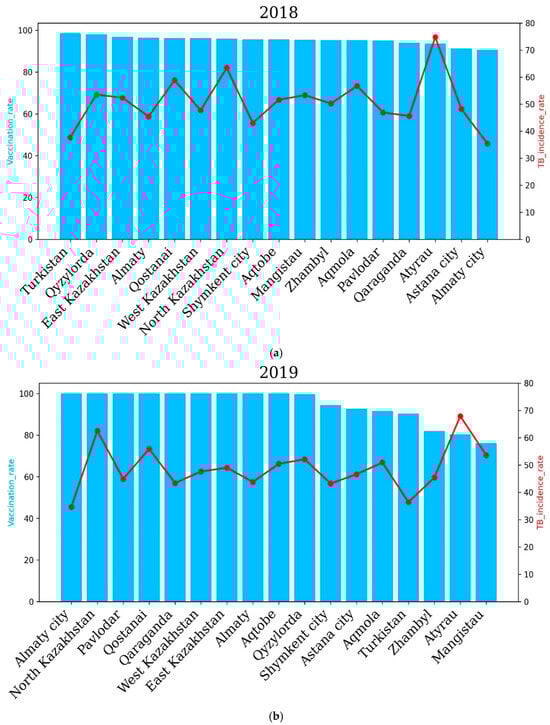 To assess the correlation between the level of vaccination of newborns and the prevalence of TB in Kazakhstan, we analyzed the past six years. Our results showed that in 2018, vaccination rates had an overall positive impact on TB incidence rates in some regions of Kazakhstan. For example, regions such as Turkestan, Almaty and a city of republican significance, Shymkent, with a higher percentage of vaccinated newborns showed lower TB incidence rates compared to the Atyrau and North Kazakhstan regions. The highest incidence rate of 74.8 cases per 100,000 people was recorded in Atyrau, although the vaccination rate was 93.5% The lowest incidence rate of tuberculosis in Turkestan (in 2018) was 37.7 cases per 100,000 and correlates with the vaccination rate, as in this region, it amounted to 98.5% (