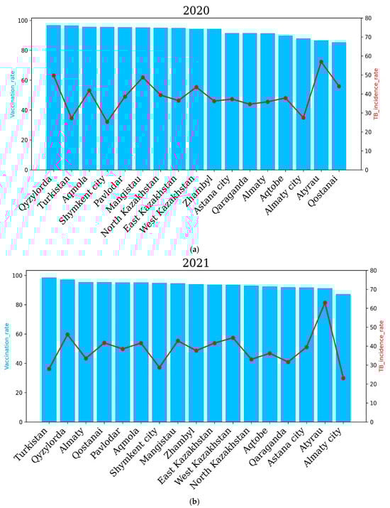 The incidence rate of tuberculosis in the republic for 2020, compared to 2019, decreased by 20.7%, and 6694 newly detected cases of tuberculosis were registered (2019—8436). The incidence rate per 100,000 population amounted to 36.6 cases against 46.2 for 2019. The level of tuberculosis morbidity in the republic for 2021 compared to 2020 increased by 0.6%, and 6824 first-time TB cases were registered (2020—6694 cases). In 2021, the highest incidence of tuberculosis was observed in the Qyzylorda, Atyrau, Mangistau, West Kazakhstan and North Kazakhstan regions. The Qyzylorda and Atyrau oblasts recorded 46.1% and 62.9% TB incidence, respectively. Interestingly, the Qyzylorda and Atyrau oblasts were among the regions with the highest vaccination rates, at 97.1 percent for Qyzylorda and 91.2 percent for Atyrau, which correlates with the vaccination rates of newborns. The lowest incidence rates of 28, 28.7 and 23.1 cases per 100 thousand people were demonstrated by the Turkestan region and Almaty and Shymkent cities, respectively. Vaccination rates for the Turkestan region and Almaty and Shymkent cities were 98.5%, 87.2% and 94.8%, respectively. These results show that vaccination rates are positively correlated with TB incidence rates.