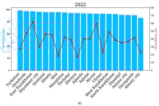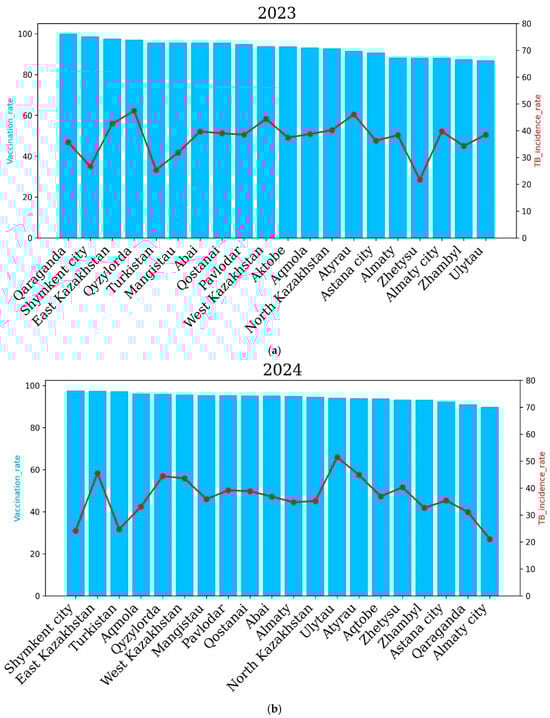 In 2022, the East Kazakhstan, Atyrau, Qyzylorda, West Kazakhstan, Qostanai and Almaty regions demonstrated higher incidence rates compared to other regions of the country, which correlated with the level of newborn vaccination. The East Kazakhstan and Atyrau regions demonstrated the highest incidence rates of tuberculosis in 2022—61.64 and 59.58 cases per 100 thousand people, respectively. Interestingly, the vaccination rate was 97% and 93.2% for the East Kazakhstan and Atyrau regions, respectively. The Abai and Zhetysu regions demonstrated the lowest incidence rates of tuberculosis in 2022—18.3 and 16.99 cases per 100,000 people, respectively. The vaccination rate for the Abai and Zhetysu regions was 95.5% and 93.9%, respectively.