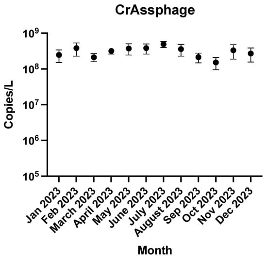 Monthly average concentrations of crAssphage in Bloomington wastewater over a year. The bars are standard deviation for four samples collected each month (n = 4).