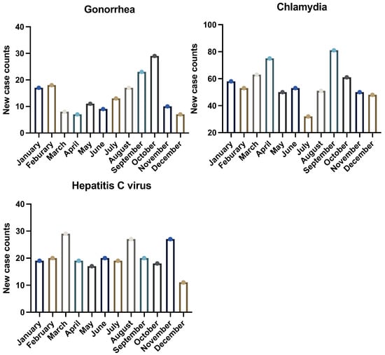 Clinically, the highest number of Chlamydia cases was reported in September (81 cases), followed by April (75 cases), and the lowest in July (32 cases) (Figure 2). Through WBE, Chlamydia was detected intermittently, with two notable detection periods observed—one in January and one in October—though overall concentrations remained consistent when detected (Figure 3). However, during the remaining months, concentrations were consistently not detected. Syphilis exhibited sporadic detection in wastewater samples, with a high concentration of 3.24 log10 copies/L in April and additional detections observed in January and September. No detectable concentrations were observed during the other months. Clinical reports for syphilis indicated minimal recorded cases, consistently fewer than five per month, except for January and April, which reported zero cases. Gonorrhea displayed variable concentrations, with the highest average concentration recorded in September (3.60 log10 copies/L), followed by December (3.24 log10 copies/L) and August (3.20 log10 copies/L). Lower concentrations were noted in June, November, and October. Clinical case reports peaked in October (29 cases) and September (23 cases), with the lowest reported in April and December (7 cases each).