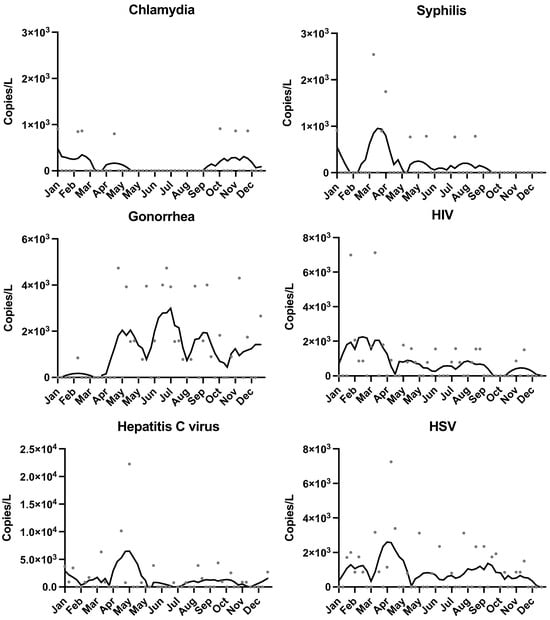 Although HCV was detected in roughly half of the samples, its concentrations fluctuated more than any other target, with several weeks falling below the limit of detection, followed by discernible surges. The biology of HCV transmission differs markedly from that of the classical bacterial STIs []. Fecal shedding of HCV RNA has been documented in both acute and chronic phases [], but the magnitude and duration of shedding are highly variable and may be influenced by liver disease stage, antiviral therapy, and gut inflammation []. The intermittent detection pattern observed here is therefore biologically plausible and may indicate episodic shedding from a relatively small pool of viremic individuals []. These fluctuations likely also result from the combination of other biological factors and possible methodological limitations, including matrix inhibition and the inherent sensitivity threshold of digital PCR.