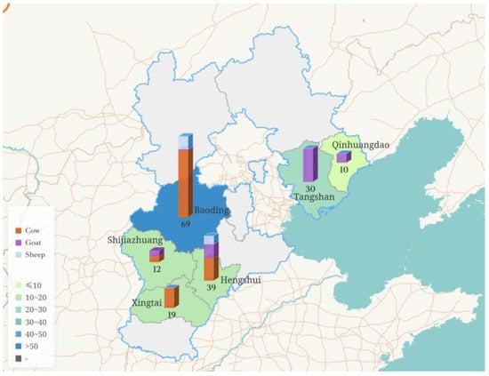 From March 2024 to April 2025, a total of 179 milk samples, including cow milk, sheep milk, and goat milk, were collected from Shijiazhuang, Baoding, Hengshui, Xingtai, Qinhuangdao, and Tangshan in Hebei Province, China (Figure 1). All samples were transported in insulated boxes with ice packs (4 ± 0.5 °C) to the laboratory for immediate processing or were stored at −80 °C until they were tested.