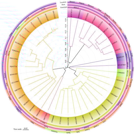 The obtained nucleotide sequences were aligned for homology analysis with other known HEV sequences in GenBank on the NCBI (National Center for Biotechnology Information) (https://www.ncbi.nlm.nih.gov (accessed on 11 February 2025)). Using the ML (Maximum Likelihood) method in MEGA 11.0 software, a phylogenetic tree was constructed with the obtained nucleotide sequences and 42 reference sequences of different HEV genotypes. The phylogenetic tree was labeled and refined using the online tool tvBOT [30]. The HEV reference sequences were sourced from the GenBank database. The standard classification of HEV genotypes and subtypes was based on the research of Smith and others [10].