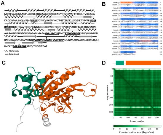 Prediction of secondary and tertiary structures of TvRAD51 in T. vaginalis. (A) Functional domains in TvRAD51 are shown in bold letters in the secondary structure, α-helix strands are represented as ribbons and β-strands as arrows; polymerization motif (PM) (·), Walker A (+) and B (◊) motif, L1 (▪) and L2 (Δ) regions, and ATP cap (*). (B) Model-Template alignment theoretical AlphaFold DB model of A2FXT7_TRIV3 [gene: A2FXT7_TRIV3 from T. vaginalis (strain ATCC PRA-98/G3)] with 100.00% Coverage. Analysis was performed in https://swissmodel.expasy.org/interactive/Y65n8C/models/ (accessed on 15 March 2025). (C) Three-dimensional model structure of TvRAD51 generated on Alphafold https://alphafold.ebi.ac.uk/entry/A2FXT7 (accessed on 15 March 2025) showing the two main domains (domain 1 in green and domain 2 in orange) according to the Encyclopedia of Domains (TED) with an average per-residue model confidence score (pLDDT) of 92.94. (D) Structural evaluation of the TvRAD51 model. The predicted aligned error (PAE) map indicates overall high confidence in the structure, with low uncertainty between the defined domains: domain 1 (residues 18–72, CATH 1.10.150.20) and domain 2 (residues 86–328, CATH 3.40.50.300). A localized region (~residues 250–300) exhibits increased structural variability.