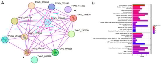 Core protein–protein interaction network analysis of putative HR machinery proteins in T. vaginalis. (A) The network depicts interactions among 12 proteins, where colored nodes represent query proteins and their first shell of interactors, while white nodes indicate the second shell of interactors. Empty nodes correspond to proteins with unknown 3D structures, and filled nodes denote proteins with known or predicted 3D structures. Edges shown in magenta represent experimentally validated interactions. TvRAD51 [TVAG_204070 (A2FXT7) is marked with an asterisk (*) and TvRAD54B [TVAG_441050 (A2FSS0) is marked with a plus symbol (+)],. The full list of node names and accession numbers and other analyzed parameters are provided in Supplementary Figure S3. (B) GO enrichment analysis illustrating biological processes, molecular functions, and cellular components associated with TvRAD51 and its interacting proteins. Statistical significance is expressed as −log10(p-value), with gene counts shown for each category.