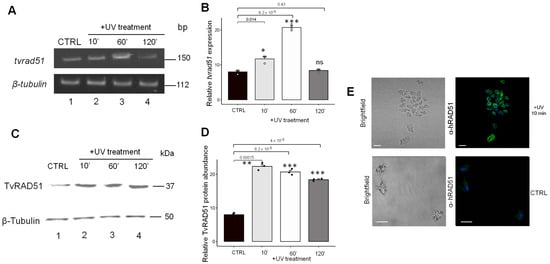 Expression and abundance of the TvRAD51 protein in T. vaginalis following UV-irradiation treatment (A). Expression of tvrad51 by RT-PCR assays with specific primers for tvrad51 fragment gene (150 bp) showing gene expression upregulated by irradiation (lane 1: control (CTRL), lane 2: 10 min, lane 3: 30 min, lane 4: 60 min, and lane 5: 120 min). (B) Densitometric analysis of pixel intensity for tvrad51 expression. (C) 37 kDa band immunorecognized by anti-hRAD51 antibodies (lane 1: control (CTRL), lane 2: 10 min, lane 3: 60 min, and lane 4: 120 min). (D) Densitometric analysis of pixel intensity for TvRAD51 protein abundance of three biological independent assays were performed and statistical significance was determined by ANOVA and post hoc Tukey test, comparing the standard deviations (SDs) of each condition. Relative gene expression and protein abundance was normalized with protein loading control: anti-human α-tubulin (50 kDa) or β-tubulin gene fragment (112 bp). A p-value of <0.001 was considered statistically significant (***), p < 0.01 (**), p < 0.05 (*), ns: not statistically significance. (E) Localization of TvRAD51 in 10 min of UV-treated parasites (upper panel) and CTRL (lower panel) of T. vaginalis CNCD 147 incubated with α-hTvRAD51 followed by FITC-conjugated goat anti-mouse IgG. Weak green signal (FITC) was detected in CTRL condition. The slides were observed at 40× magnification by confocal microscopy (Leica). Scale bar indicates 60 μm.
