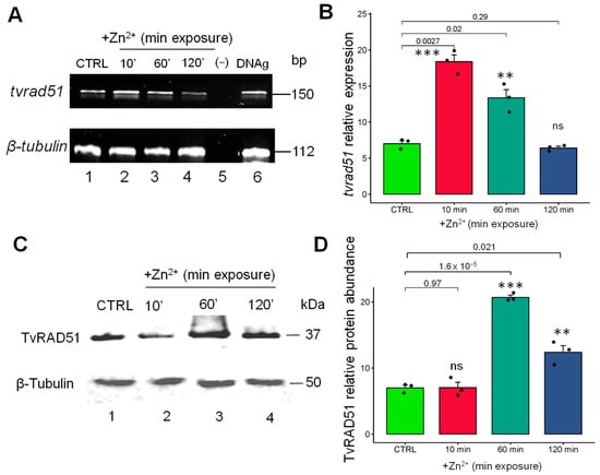 Expression and abundance of the TvRAD51 protein in T. vaginalis following Zn2+ treatment (1.6 mM). (A) Expression of tvrad51 by RT-PCR assays with specific primers for tvrad51 fragment gene (150 bp), showing the time course gene expression upregulated by Zn2+1.6 mM (lane 1: control (CTRL), lane 2: 10 min, lane 3: 30 min, lane 4: 60 min, and lane 5: 120 min). (B) Densitometric analysis of pixel intensity for tvrad51 expression. (C) 37 kDa band immunorecognized by anti-hRAD51 antibodies (lane 1: control (CTRL), lane 2: 10 min, lane 3: 60 min, lane 4: 120 min, and lane 5: 24 h). (D) Densitometric analysis of pixel intensity for TvRAD51 protein abundance of three biological independent assays were performed and statistical significance was determined by ANOVA and post hoc Tukey test, comparing the standard deviations (SDs) of each condition. Relative gene expression and protein abundance was normalized with protein loading control: anti-human α-tubulin (50 kDa) or β-tubulin gene fragment (112 bp). A p-value of <0.001 was considered statistically significant (***), p < 0.05 (**), ns: not statistically significance.