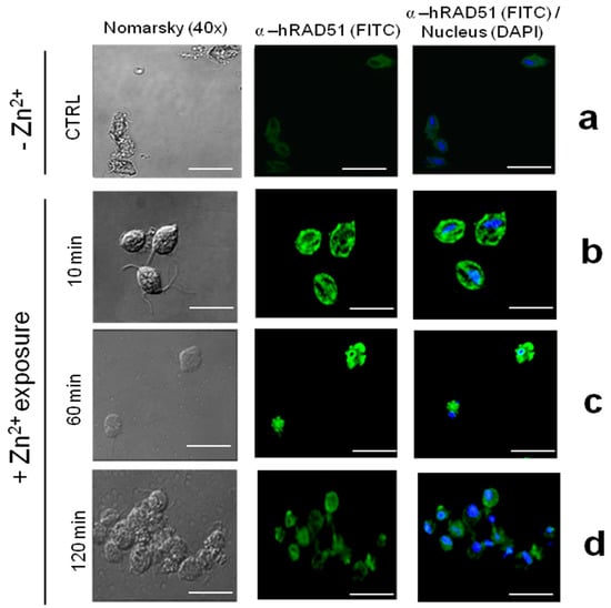 Localization of TvRAD51 in T. vaginalis CNCD 147 isolate in Cd2+ exposure. (a) Parasites grown with no added Zn2+ in medium (-Zn2+, CTRL), fixedm and incubated with α-hTvRAD51, followed by FITC-conjugated goat anti-mouse IgG and DAPI for nucleus stain. (b) Localization of TvRAD51 in parasites exposed to zinc (+Zn2+) for 10 min, (c) 60 min, and (d) 120 min of exposure. Green signal (FITC) was merged with DAPI (blue signal). Two independent assays were performed, and the slides were observed at 40× magnification by confocal microscopy (Leica). Scale bar indicates 60 μm.