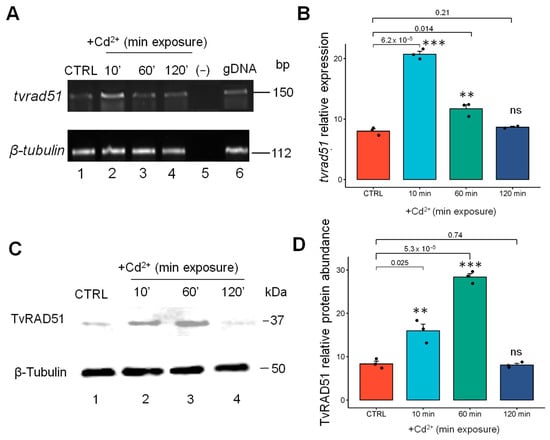 Expression and protein abundance of the TvRAD51 protein in T. vaginalis following Cd2+ treatment (0.1 mM). (A) Expression of tvrad51 by RT-PCR assays with specific primers for tvrad51 gene, showing the time course gene expression upregulated by Zn2+1.6 mM (lane 1: control (CTRL), lane 2: 10 min, lane 3: 30 min, lane 4: 60 min, and lane 5: 120 min). (B) Densitometric analysis of pixel intensity for tvrad51 expression. (C) 37 kDa band immunorecognized by anti-hRAD51 antibodies (lane 1: control (CTRL), lane 2: 10 min, lane 3: 60 min, lane 4: 120 min, and lane 5: 24 h). (D) Densitometric analysis of pixel intensity for TvRAD51 protein abundance. Two independent assays were performed in technical triplicate, and statistical significance was determined by ANOVA and post hoc Tukey test, comparing the standard deviations (SDs) of each condition. Relative gene expression and protein abundance was normalized with protein loading control: anti-human α-tubulin (50 kDa) or β-tubulin gene fragment (112 bp). A p-value of <0.05 was considered statistically significant (***), p < 0.05 (**), ns: not statistically significance.