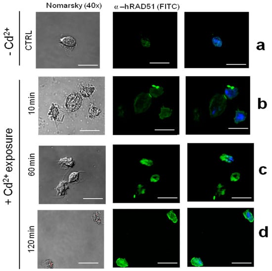 Localization of TvRAD51 in T. vaginalis CNCD 147 isolate during Cd2+ exposure. (a) Parasites grown with no added Cd2+ in medium (-Cd2+, CTRL), fixed, and incubated with α-hTvRAD51, followed by FITC-conjugated goat anti-mouse IgG and DAPI for nucleus stain. (b) Localization of TvRAD51 in parasites exposed to zinc (+Cd2+) 10 min, (c) 60 min, and (d) 120 min of exposure. Green signal (FITC) was merged with DAPI (blue signal). Two independent assays were performed, and the slides were observed at 40× magnification by confocal microscopy (Leica). Scale bar indicates 60 μm.