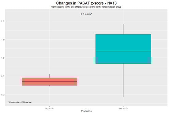 Moreover, although only 13 subjects completed the PASAT3 at both NP assessments, those on probiotics showed a significant improvement in their performance (Z-score 0.4 in controls vs. 1.2 in probiotics, p = 0.035, Figure 1).