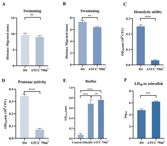 Phenotypic characterization of strain D4. (A) Swimming motility of A. hydrophila strains D4 and ATCC 7966T. (B) Swarming motility of A. hydrophila strains D4 and ATCC 7966T. (C) Hemolytic activity in the culture supernatants of A. hydrophila strains D4 and ATCC 7966T. (D) Protease activity in the culture supernatants of A. hydrophila strains D4 and ATCC 7966T. (E) Biofilm formation of A. hydrophila strains D4 and ATCC 7966T. (F) Virulence of A. hydrophila assessed in zebrafish. Three independent experiments were conducted, and the data presented are the arithmetic means ± standard deviations. ** indicates a significant difference (p < 0.01); *** indicates a significant difference (p < 0.001); **** indicates a significant difference (p < 0.0001).