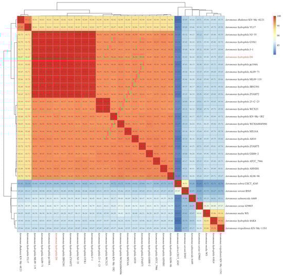 To further determine the classification of strain D4, ANI was calculated among 29 Aeromonas spp. genomes deposited in GenBank (Figure 2). As previously established, species-level classification requires ANI ≥ 95% [18]. Strain D4 clustered closely with A. hydrophila reference genomes, yielding ANI values >95%, confirming its classification as A. hydrophila. Conversely, strains YL17 and 4AK4 showed ANI values ≤ 92.88% and ≤ 86.04% with A. hydrophila genomes, respectively, suggesting potential misclassification. Subsequent analysis revealed that YL17 shared 97.1% ANI with A. dhakensis KN-Mc-6U21 and 4AK4 shared 95.5% ANI with A. rivipollensis KN-Mc-11N1, supporting their reclassification into these species. Notably, A. hydrophila strains D4, ZYAH72, NJ-35, J-1, GYK1, JBN2301, ML09-119, AL09-7, and pc104A displayed higher ANI values compared to other A. hydrophila genomes, clustering together into a distinct clade with ANI ≥ 99.74% and all belonging to ST251.