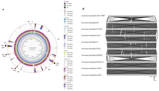 To identify potential genomic islands that may contribute to the unique characteristics of 10 A. hydrophila strains, the prediction of genomic islands in these 10 strains was performed using IslandViewer 4 with default parameters (http://pathogenomics.sfu.ca/islandviewer (accessed on 12/02/2025)).