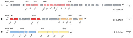 Some gene clusters in GI 11, GI 18, and GI 21. (A) The pink arrow indicates the myo-inositol utilization cluster harbored in the GI 11 region. (B) The red and orange colors indicate the pseudaminic acid biosynthesis and flagellar assembly gene cluster harbored in the GI 18 region. (C) the blue and yellow colors indicate the L-fucose metabolic pathway and a peptide ABC transport system harbored in the GI 21 region. The gray arrow indicates the genes surrounding the gene cluster.