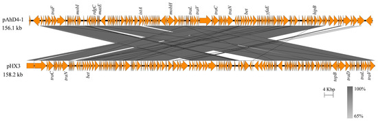 The collinearity comparison between pAhD4-1 (accession number: CP013966.1) and pHX3 (accession number: CP040718.1) was drawn using Easyfig (version 2.2.5) by inputting their GenBank files, performing BLAST alignment, and configuring parameters to analyze homologous regions and genetic distribution differences between the two plasmids.