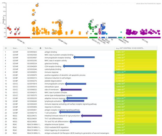 The short list was run through gProfiler (version e113_eg59_p19_6eaea45) (Figure 1) and STRINGdb (Ver. 12.0) to ascertain any pathways affected by their downregulation. The threshold for significance was set to an FDR of 0.05 and utilized all known genes from the current mouse genome build. Each analysis highlighted pathways implying the KO group’s inability to properly trigger downstream immune processes, including the complement system, adaptive immunity, and B and T cell activation, and pointed out genes related to abnormal gastrointestinal and immune physiology. Additionally, all the pathways recognized were downregulated in the KO mice because the gene list was comprised of only downregulated genes. The most prominent genes regarding pathways appeared to be CD79A antigen (immunoglobulin-associated alpha), IGHV1-5, IGHV1-53, IGHV1-82, IGKV1-117, and tumor necrosis factor receptor superfamily member 13b (TNFRSF13B). There were two DEGs with direct lymphocyte and T cell connections: B lymphoid kinase (Blk) and Lymphocyte transmembrane adapter 1 (Lax1). The gene Blk is involved in B-lymphocyte development, but it also acts to transmit signals to immunoglobulins. It is also a negative regulator of leukocyte proliferation, so its downregulation could possibly increase the functions of the innate immune response [12,17,18,19].