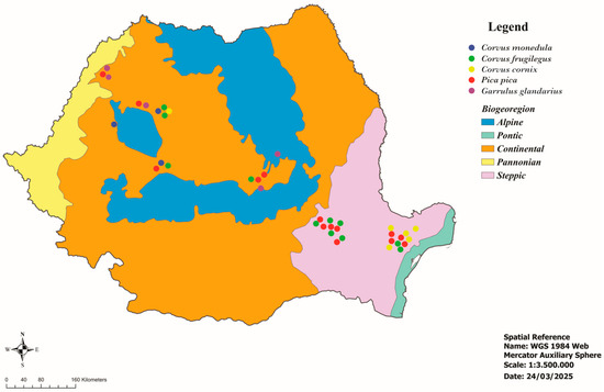 This study was performed on 333 corvids belonging to 5 species of the Corvidae family collected from all over Romania (Figure 1, Table 1). According to the Emergency Ordinance No. 7 of 6 March 2025, to amend and supplement Government Emergency Ordinance No. 57/2007 on the regime of protected natural areas, the conservation of natural habitats, and wild flora and fauna, the corvid species are not classified as protected species [21]. Therefore, most examined birds were hunted to combat the excessive number of resident corvids in certain areas or were found dead. The bird carcasses were collected, individually packaged, and frozen. The birds were identified based on morphological characters [22] and necropsied. During necropsy, the heart was collected and stored at −20 °C until processing. The meat juice samples obtained by freezing–thawing individual hearts were centrifuged at 5000 rpm for 5 min and stored at −20 °C until examined.