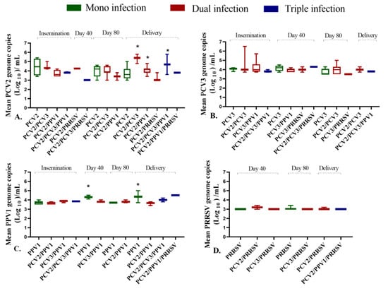 Association between viral load and type of infection during pregnancy phase (PP). This box plot illustrates the viral load of PCV2, PCV3, PPV1, and PRRSV according to the type of infection: green represents mono-infection, red indicates dual infection, and blue signifies triple infection. (A). PCV2 viral load; (B). PCV3 viral load; (C). PPV1 viral load; (D). PRRSV viral load. * Significant differences were observed (p < 0.05).