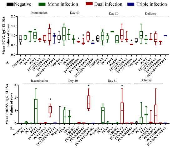 Relationship between antibody (Ab) titers for anti-PCV2 and anti-PRRSV and the type of infection detected throughout pregnancy phase (PP) in the evaluated sow population. (A). Anti-PCV2 Ab titers, (B). Anti-PRRSV Ab titers. * Significant differences (p < 0.05). The colors represent different infection types: Green indicates mono-infection, red indicates dual coinfection, and blue indicates triple coinfection.