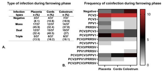 Types of viral infection (mono- and coinfections) detected in placenta, umbilical cords, and colostrum from sows (both primiparous and multiparous) across the four herds evaluated during the farrowing phase (FF). (A). Frequency of different types of infection (mono, dual and triple) detected during FP. (B). A heat map depicting the frequency and types of infection identified during FP. The color scale ranges from 0 to 20, where red represents the highest frequency of infection, black indicates a moderate frequency, and white signifies no infection.