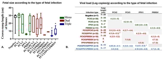 Association between infection types (mono- and coinfections), viral loads, and fetal crown-rump length (CRL). (A). This box plot illustrates the relationship between the type of infection (mono- and coinfections) detected in fetuses (stillbirths and mummies) and fetal CRL. (B). The association between fetal CRL and viral load (log copies/g) indicates the mean viral load and the minimum and maximum values for each type of infection. Mono-infections are represented in green, dual infections in red, and triple infections in blue. * Significant differences are indicated (p < 0.05).