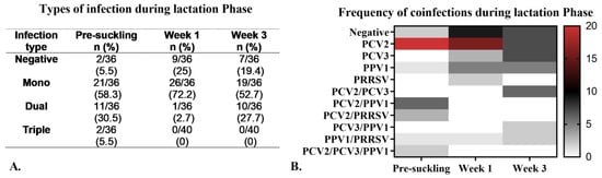 Types of infections observed during the lactation phase (LP). (A). Frequency of infection types (mono- and coinfections). (B). Heat map displaying the frequency of coinfections during the LP. The lateral scale ranges from 0 to 20, indicating the number of infections, where red represents the highest frequency, black denotes the average frequency, and white indicates the absence of the virus.