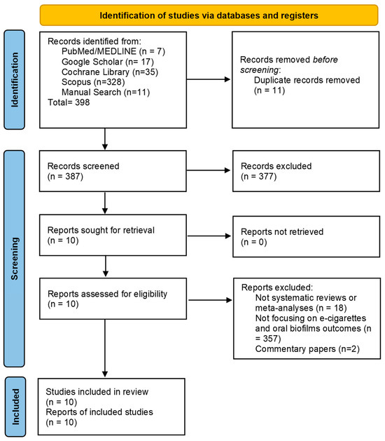 We initially retrieved a total of 398 records from electronic databases and manual searches. After removing 11 duplicate records manually, 387 records were screened. Based on the exclusion criteria, 18 papers were excluded because they were not systematic reviews or meta-analyses, 357 studies were excluded for not focusing on e-cigarettes and oral biofilm outcomes, and 2 documents were excluded for being commentaries. A total of 10 full-text articles were retrieved, all of which met the inclusion criteria. This umbrella review synthesizes data from 10 systematic reviews, with or without meta-analysis. The PRISMA [21] flowchart of the study screening process is shown in Figure 1.