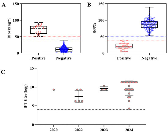 Distribution of ASFV-specific antibodies in pig serum samples collected from ASF outbreak farms in South Korea, classified according to the results from two types of commercial ELISA kits and the WOAH reference for IPT titration. (A) Results from the Ingezim ELISA kit (Blocking%, n = 2232) and (B) result from the ID.vet competition ELISA kit (competition percentage; S/N%, n = 675). The red dashed line represents the positive cutoff value, and the blue dashed line represents the negative cutoff value. (C) Individual sera that were positive or doubtful in the ELISA assay (n = 32, expect for 8 negative) were examined for antibodies against ASFV by the IPT at the yearly time point. Data are represented as the mean ± SD. Sera with IPT titers ≥ 1:20 are considered positive and the dashed line show the limits of detection. There were no seropositive samples in 2019 and 2021.