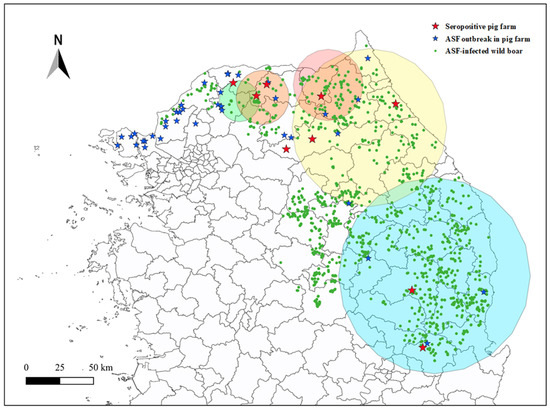 This study presents, for the first time, valuable insight into the spatial relationship between circular buffers of wild boar movement ranges related to hotspots of ASF-infective wild boars and domestic pig farms with serological evidence of ASFV exposure in South Korea. This study observed a statistically significant association between these buffers and the location of ASFV-seropositive pig farms. The findings suggest a statistical correlation between domestic pig farms located near wild boar ASF hotspots and increased antibody positivity, underscoring the potential role of wild boars in ASFV transmission. However, it is important to note that antibody assays using ELISA may yield false positive and false negative results, which should be taken into consideration when interpreting these findings. Consequently, it is imperative to refrain from drawing definitive conclusions regarding antibody positivity exclusively based on ELISA findings. This underscores the necessity for supplementary confirmatory assays, such as the IPT, in addition to ELISA. Collectively, this study provides important information regarding seropositivity on swine farms and effective surveillance to facilitate biosecurity.