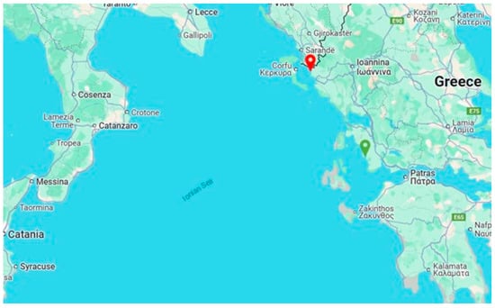 A map of the Ionian Sea, located between southern Italy and western Greece, with key locations marked. The red location symbol indicates Sagiada Bay, while the green symbol denotes the Astakos Gulf (Source: Google Maps).