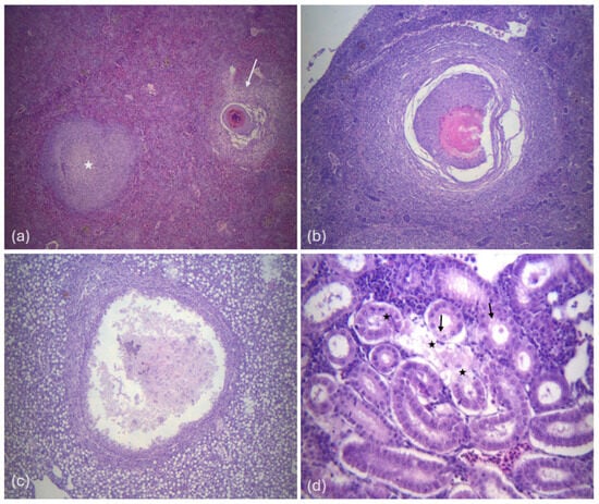 (a) Histological section of the spleen; displays an early-stage granuloma (star) as well as a fully developed granuloma (arrow) (magnification ×40), (b) spleen tissue section showing a typical granuloma (magnification ×100), (c) liver histological section showing an abscess formation. There is a visible central region of amorphous necrotic proteinaceous material within a collagenous capsule. (magnification ×100), (d) kidney histological section showing tubules with necrosis (star), and degeneration of some epithelial cells (arrows) (magnification ×400).