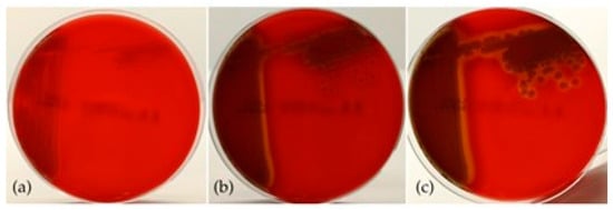 Hemolytic activity in BA, after (a) 24 h, (b) 48 h, and (c) 72 h of incubation.