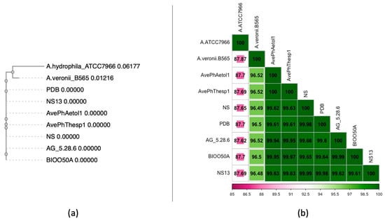Taxonomic classification of the sequencing products validated the isolation of Aeromonas veronii (taxid 654) samples. Following quality assessment of the 150 bp paired-end reads, the resulting ~12.5 Mbp sequencing products of each isolate were assembled into 113 (N50: 86,929) and 112 contigs of the AveP hThesp1 and AvePhAetol1 samples, respectively, with N50 value of 86.9 kb for both assembled genomes. Both isolates are assigned to ST23. Comparative analysis against Aeromonas veronii strains isolated from both Ionian (AvePhThesp1, AvePhAetol1) and Aegean Sea (NS13, NS, AG_5.28.6, PDB, BIOO50A) verified the expected 100% identity of the MLST genes and distinct genetic composition for representative isolates (A. hydrophila ATCC7966 and A. veronii B565) as shown in the phylogenetic tree (Figure 6a). Further analysis of the whole-genome average nucleotide identity revealed that on genome-wide level the Ionian Sea genomes were 100% identical, while the similarity level against the Aegean Sea genomes was slightly lower ranging between 99.61% and 99.97% (Figure 6b). As expected, more pronounced genetic variation is observed in the representative genome assemblies 96.48–96.52% for A. veronii B565 and 87.62–87.87% for A. hydrophila ATCC7966.