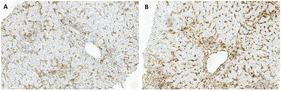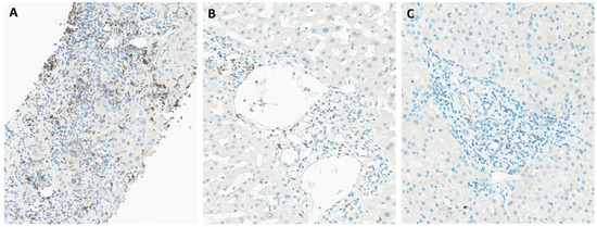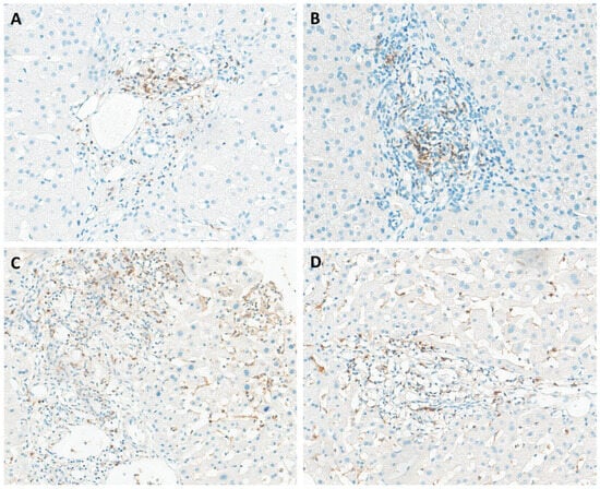 Programmed cell death protein 1 (PD-1), also referred to as CD279, is an immune checkpoint receptor predominantly expressed on T cells, B cells, and NK cells. Its two ligands, PD-L1 (also known as B7-H1 or CD274) and PD-L2 (B7-DC or CD273), are expressed by various immune cells and tissues [21]. PD-L1 is notably upregulated by antigen-presenting cells (APCs) and non-lymphoid tissues, including the liver, while PD-L2 is primarily expressed by macrophages and dendritic cells (DCs) [22]. The main role of PD-1 is to regulate inflammatory responses during infections and prevent autoimmunity, by modulating the activity of effector T cells within peripheral tissues [23]. PD-1 was detected in 43% (13/30) of samples and its expression, predominantly observed in portal tracts, with additional presence in sinusoids (Figure 1A). Conversely, PD-L1 exhibited more focal staining patterns (Figure 1B), with only 10% (3/30) of patients being positive for this ligand. PD-L2 expression was absent from all liver samples obtained from CHB patients. Consistent with our findings, previous studies have reported predominant PD-1 expression in infiltrating lymphocytes within the portal area of the liver in patients with CHB [24,25,26]. Additionally, PD-1 expression was detected in the lobular region [24] and within the sinusoids [25]. In agreement with our findings, Wang et al. similarly reported weakly detectable PD-L1 and PD-L2 expression in liver tissues affected by hepatitis B [27]. They noted that cells expressing PD-L1 and PD-L2 were distinctly different from lymphocytes and hepatocytes, likely representing Kupffer cells (KCs) and liver sinusoidal endothelial cells (LSECs) [27]. Chen et al. associated the presence of PD-L1-positive cells with their localization near the portal area in the liver as well as the sinusoidal area [26]. While some studies have shown increased PD-L1 expression on KCs) in patients with CHB [24,28], others have reported no significant alterations in PD-L1 levels on KCs during HBV infection [26,27,29]. PD-L2-positive cells were infrequently observed in the liver tissues of patients with chronic hepatitis B [26]. Additionally, cells expressing PD-1, PD-L1, and PD-L2 cells were not present in the hepatic tissue from healthy controls [25,26].