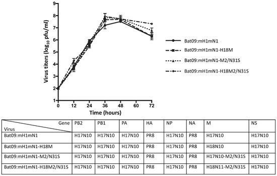 As wild-type bat influenza viruses do not cause CPEs in susceptible cells such as MDCK II and RIE1495 [8], the chimeric Bat09:mH1mN1 virus, which has six internal genes from the bat H17N10 virus and two surface HA and NA coding regions from the PR8 H1N1 virus with respective bat H17N10 gene packing signals, was used in this study [30]. To investigate whether M genes from both H17N10 and H18N11 have similar functions and impacts on virus replication, the recombinant Bat09:mH1mN1-H18M was generated using reverse genetics by replacing the M gene of H17N10 with the H18N11 M gene. Previous studies have shown that conventional IAVs with serine (S) at position 31 in M2 are sensitive to amantadine [35,36], while the M2 from either H17N10 or H18N11 virus has an asparagine (N) at position 31, which is expected to confer resistance to amantadine. We generated single-M2-N31S-mutant viruses in the chimeric Bat09:mH1mN1 and recombinant Bat09:mH1mN1-H18M genetic backgrounds, resulting in single-mutant Bat09:mH1mN1-M2-N31S and Bat09:mH1mN1-H18M2-N31S viruses. Growth kinetics analysis showed that both Bat09:mH1mN1 and recombinant Bat09:mH1mN1-H18M replicated to a similar level on MDCK cells (Figure 1). Single N31S substitutions in H17 and H18 M2 in each virus did not impact virus replication on MDCK cells based on growth dynamics when compared with their respective parental viruses (Figure 1).